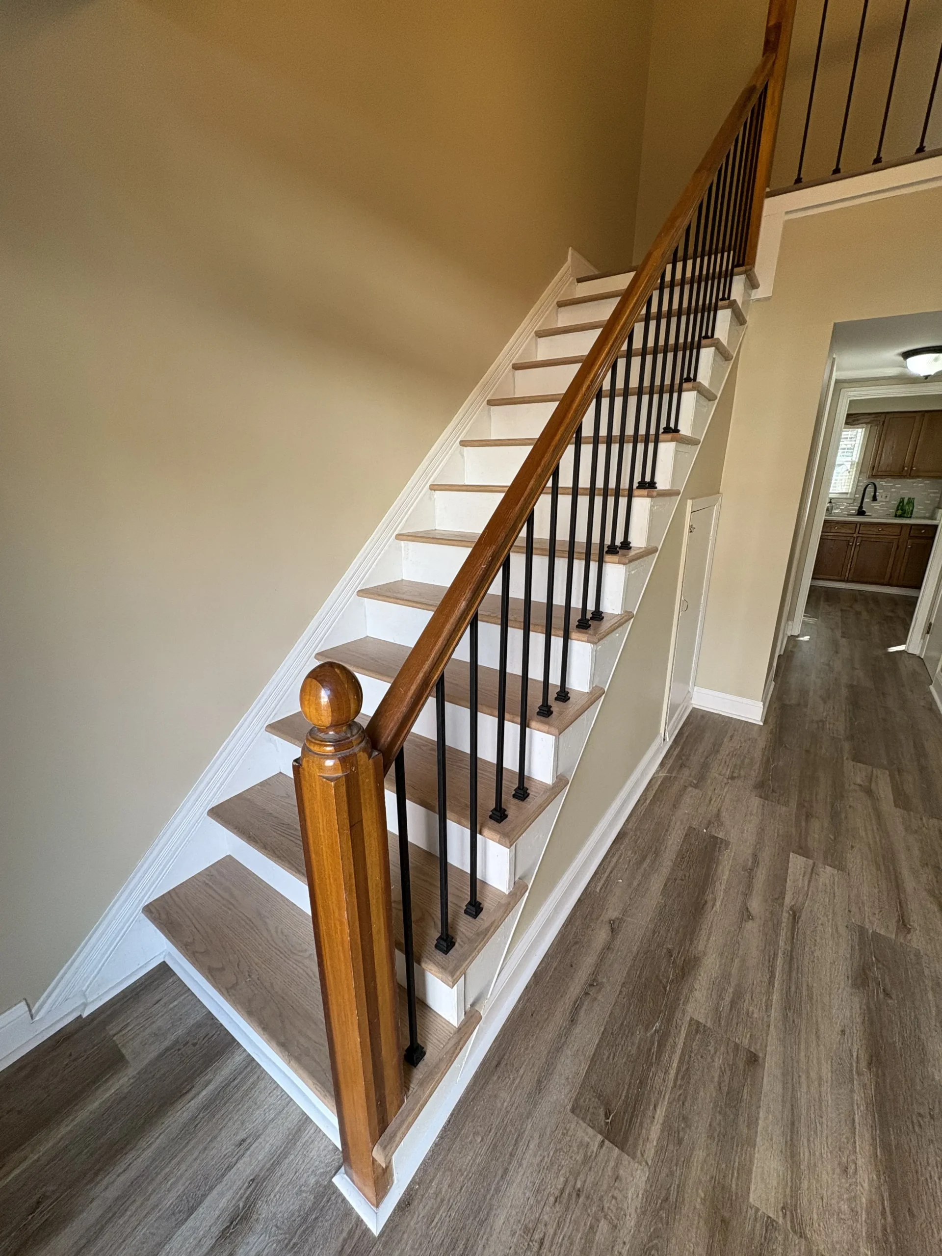 Easy to Maintain: Staircase flooring: is low-maintenance, requiring only regular sweeping and occasional mopping to keep it looking fresh. Unlike carpets, which can trap dirt and allergens, hardwood, vinyl, and laminate flooring are easy to clean and maintain. These floors are designed to handle high-traffic areas while staying clean and looking beautiful for years.